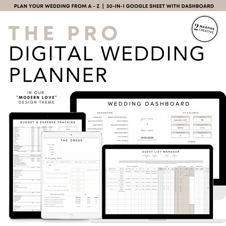 We are not a digital product company – we are a wedding and event planning company, so it is with confidence that we say we thought of it all when putting together “The Pro”. It’s our biggest, baddest, most comprehensive digital wedding planner available. In fact, we think it might just be the best dang planner on the web. We can tell others agree as you’ll see a lot of imitations of this planner on Etsy. Shop assured knowing that this item is the original. It was built from scratch by 2 Magpies Creative based on 2 decades worth of real event planning experience. If you are planning your own wedding, or planning with light support from a day-of or month-of planner – this is the item for you. Please be sure to read the entire item description as well as our Shop FAQs prior to making your purchase.